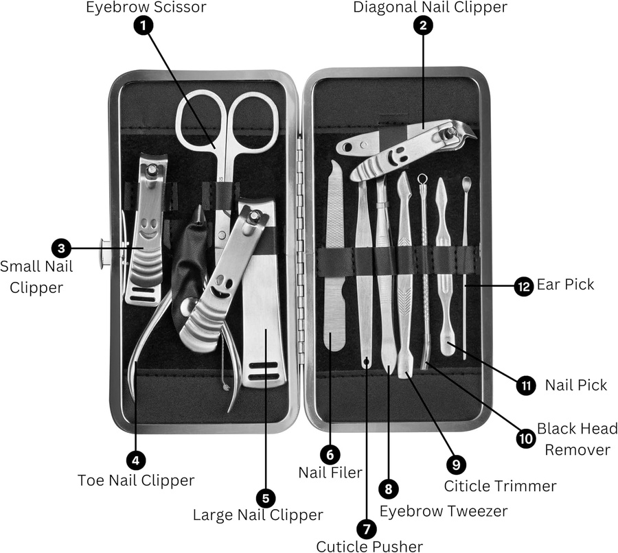 مجموعة مكونة من 12 أداة احترافية للعناية بالأظافر مع شنطة سفر أنيقة، مناسبة للرجال والنساء. مثالية للعناية اليومية أو أثناء السفر – تصميم عملي وجودة عالية.