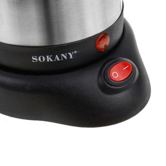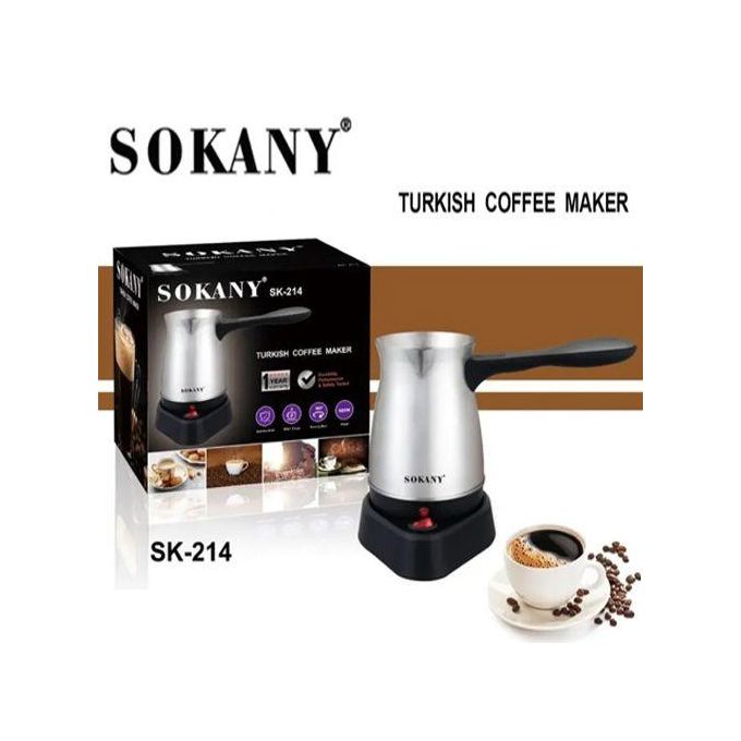 غلاية قهوة كهربائية من سوكاني (SK-214) بسعة 0.5 لتر وقوة 600 وات. تصميم من الستانلس ستيل الفضي، قاعدة دوارة منفصلة، لتحضير سريع وآمن للقهوة التركية.